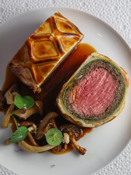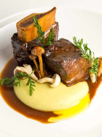 by SureshThis is an unrepentantly indulgent comfort food dish which balances melt-in-the-mouth beef with creamy, cheesy, potato and lightly sautéed mushrooms. The natural astringency in the reduction sauce from the braise plus the light vinaigrette on the mushrooms really lifts the dish and stops it being way too heavy. Roquefort loves beef but also brings a satisfying acidity which also helps balance the whole thing...