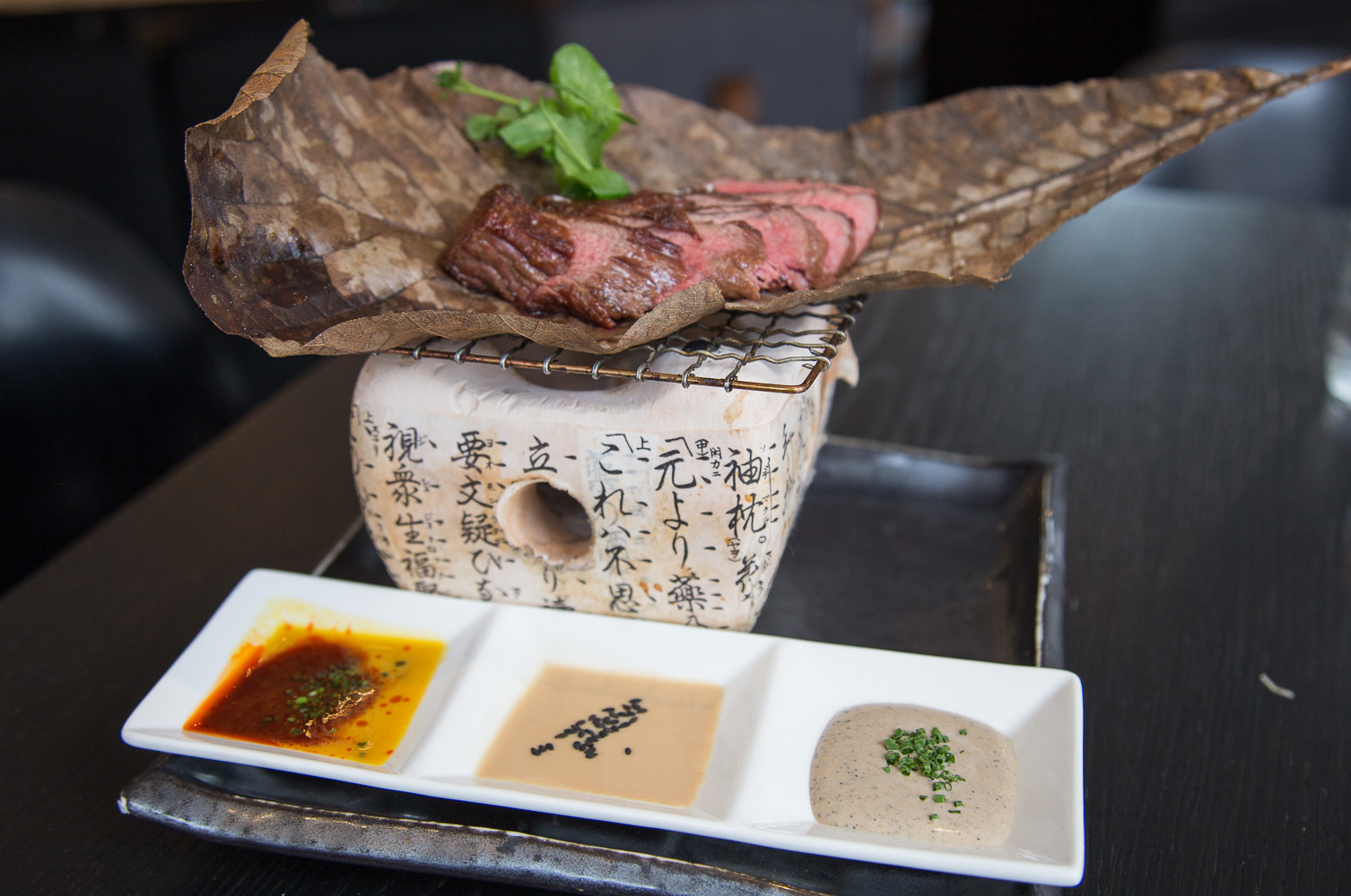 Sadly the rollercoaster came crashing down again as the main course cane out. Wagyu steak with varied dipping sauces. The steak itself was cooked ok, medium rare, though had they bothered to ask how I wanted it cooked, I most certainly would have had it rarer. It was ok at best. The sauces were oddly balanced when eaten one after another and generally overpowered the delicate wagyu individually. It was served on a non-lit Japanese BBQ, upon a huge dried leaf. The presentation pretty much summed up the meal to me. Pretentious, happily superficial and lacking any substance.