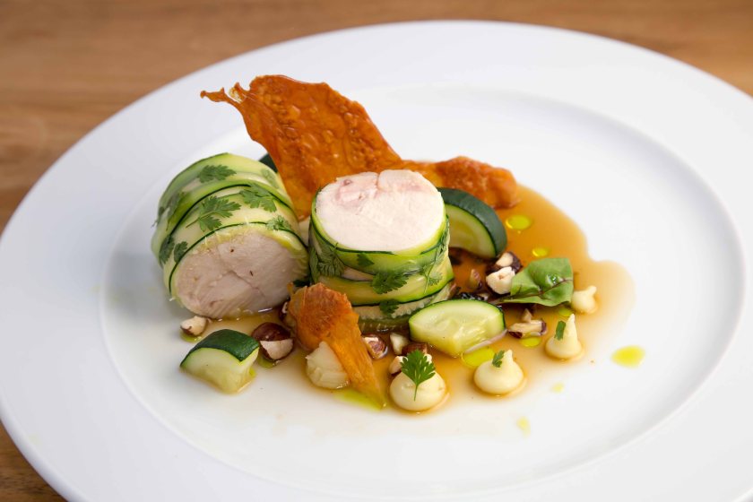 5. Unwrap the cooked chicken and slice into rounds. Pipe or spoon some potato around as you wish and garnish with crispy skin, more courgette, chicken stock reduction and chopped hazelnuts.