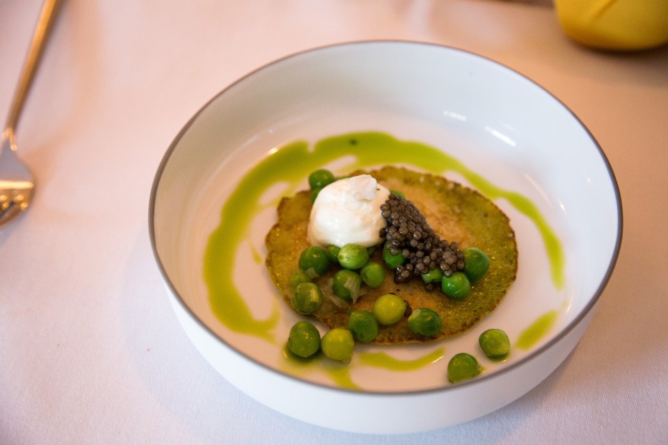 Potato pancake with peas and caviar