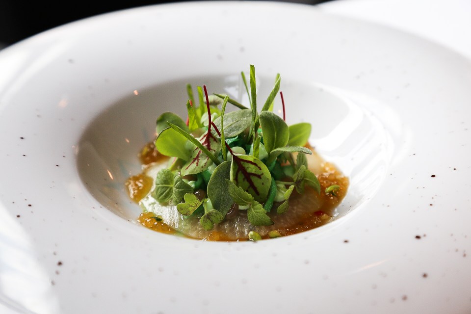 Preparations of kolrabi, wasabi mayo, soy tapioca