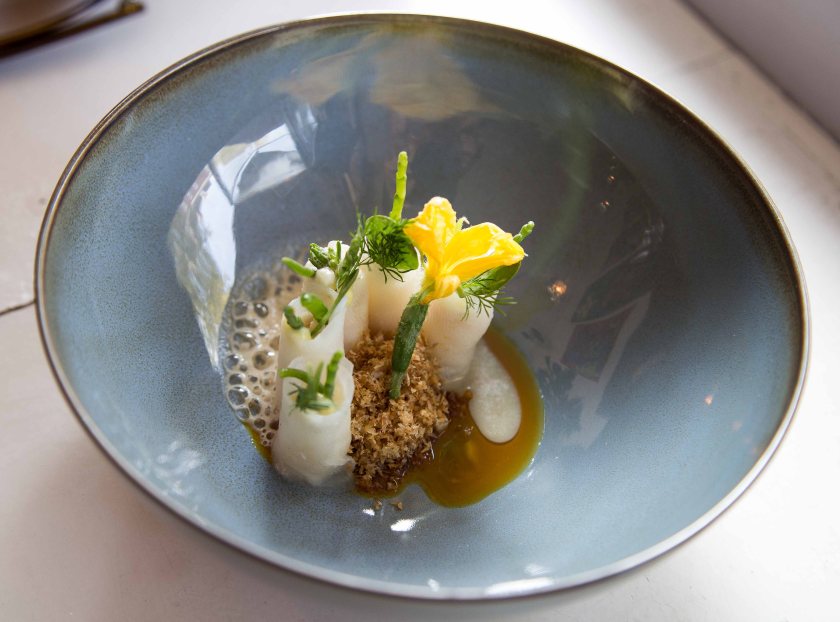 So far so good, and with the restaurant slowly filling up, we moved to a full-blown vegetarian dish of baked celeriac and egg. For a change, we opted for another glass of wine, enjoying the minerally freshness of an well-legged Austrian Resiling which paired fabulously with the uber-rich plate. Indeed it would also have been good with the Thai cod had we been quicker. The 60 degree egg had a very satisfying gel texture, (which was fortunate given I was immediately given Nadya’s one too), bolstered by the rich hollandaise and deeply savoury blackened garlic foam. Hiding underneath, through some truffle, was a stupidly delicious hazelnut cream, which together with the superstructure elements gave a decent hint of lardo-like fatty umami. This was a very accomplished, balanced, piece of cooking but oh so rich… I was already getting full and we had two more courses to go.