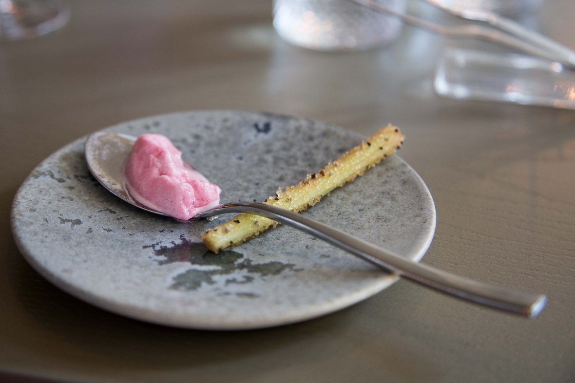 Rosemary and rhubarb iceream with rhubarb in sugar and pepper