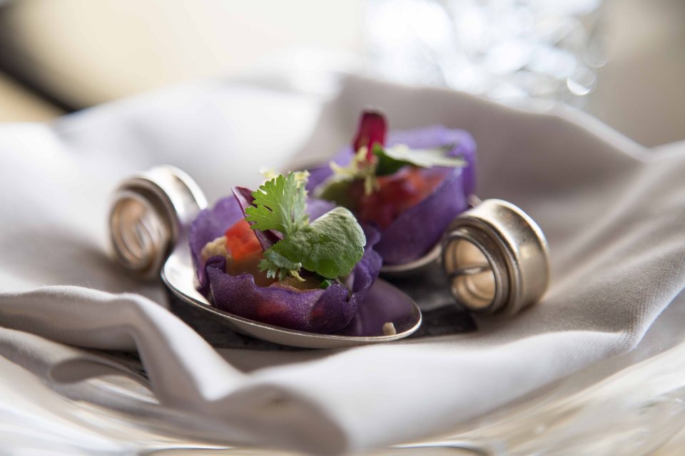 Vitelotte potato crisp with hamachi ceviche and avocado
