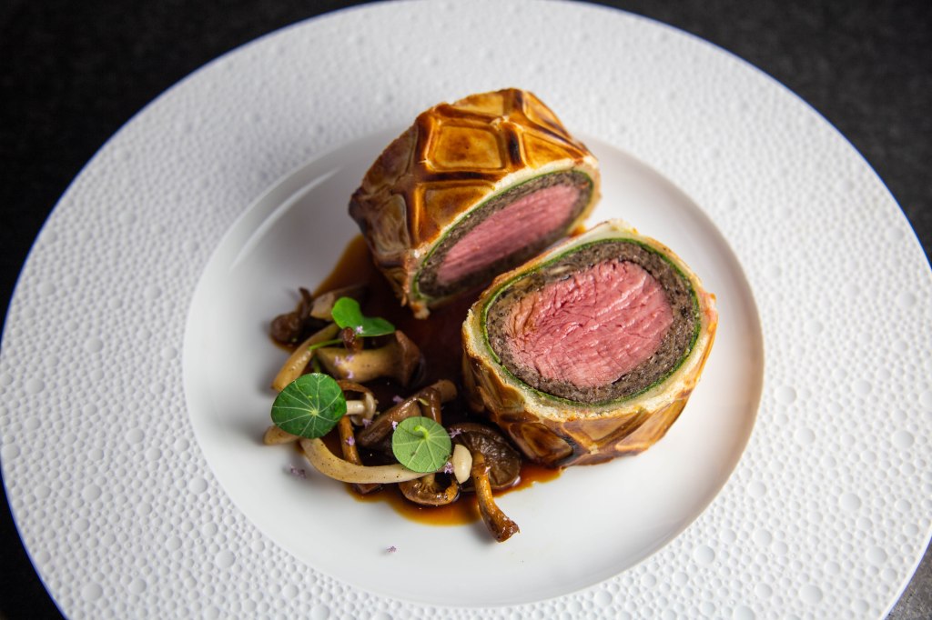 12. Cut 2 inch slices with a serated knife and immediately turn them face down to stop any juices making the bottom of the pastry soggy. Serve with sautéd mushrooms and the sauce.