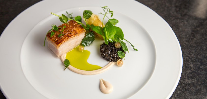 This dish is a version of surf and turf which turned out extremely delicious and nicely balanced; it has fatty, juicy meat with a very crisp skin, smokiness from the fish, acid from the white currant, ozoney salinity from the caviar and earthiness from the potato. The herbs bring some freshness and zing. To get the perfect glass-like crispy skin I use a method adapted from Peking duck. Ingredients: (Serves 2) 500g pork belly with skin Caviar – as much as you can afford. This is baeri caviar which is very good but won’t require you to remortgage your house. Ratte potatoes – handful Smoked fish – this is smoked trout but mackerel would also work very well Mint – bunch Pea shoots – bunch Cream- dash White currants – punnet Olive oil Lemon balm oil (optional) See previous posts about how to make herb oils Equiptment : Sous vide / Blender/ Sieve Method: 1.  Prepare the pork belly. Having experimented quite a lot to get the perfect combination of crispy skin and juicy flesh with …